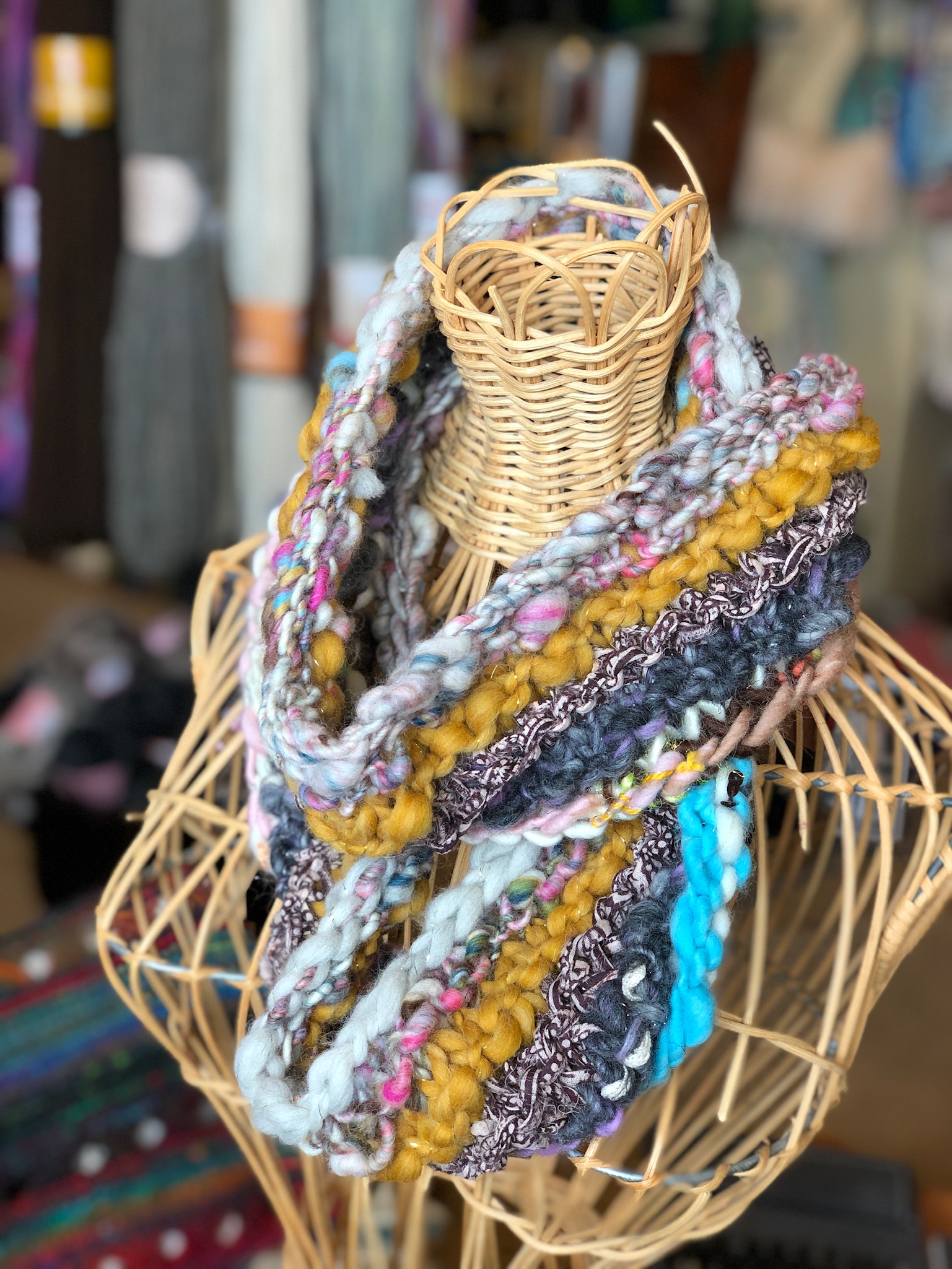 Yarn E: Gypsy Garden or Rolling Stone ~ a mix of wool/mohair and sparkly fibers – content varies based on color ~ 17 yards