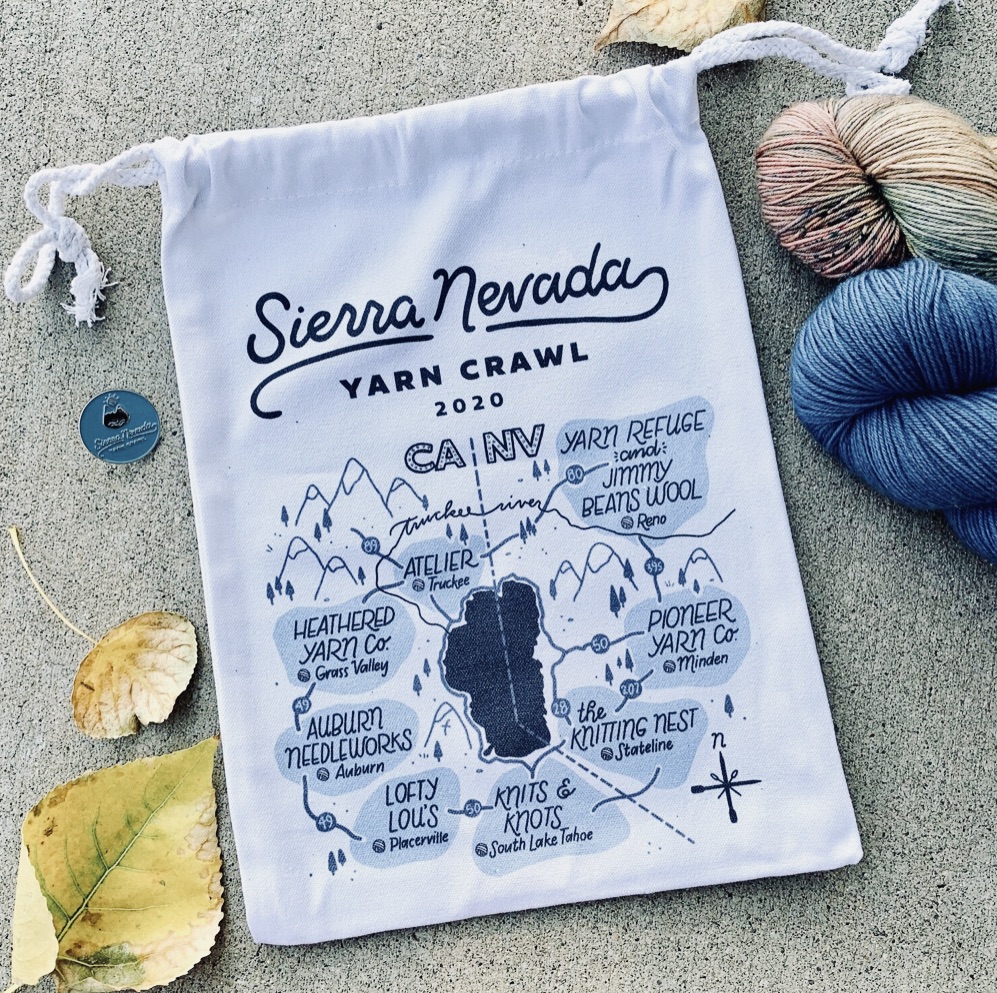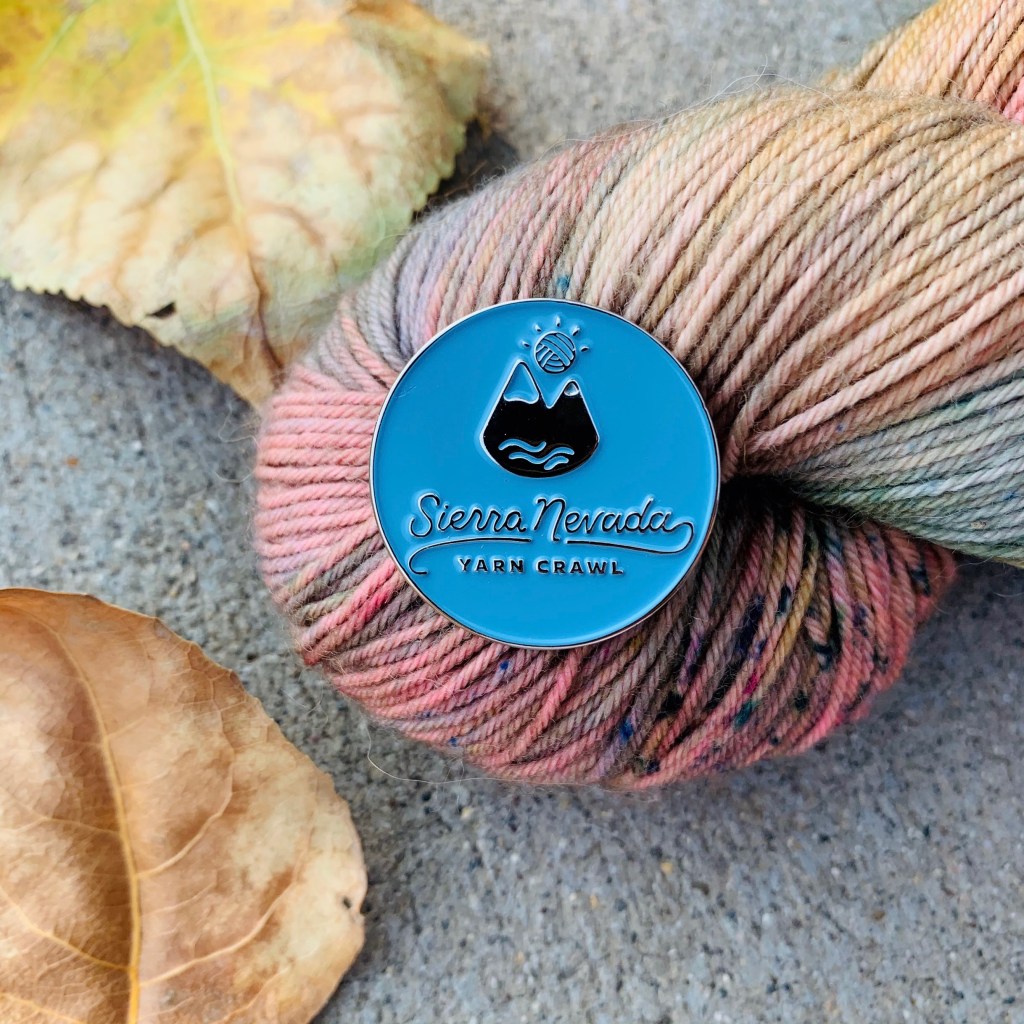 Celebrate the Second Annual Sierra Nevada Virtual Yarn Crawl with the official yarn crawl bag and enamel pin! This year’s bag features a beautiful map of the participating yarn shops throughout the Sierra Nevadas, while the pin displays the Sierra Nevada Yarn Crawl logo. This is the perfect way to stash a new, smaller project (perhaps one from the crawl?). Bags ($10) and pins ($5) are available now!
