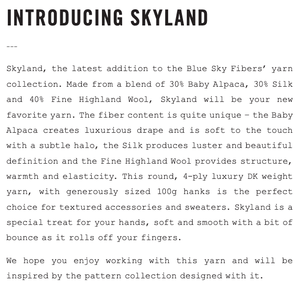 Just in… Skyland – a brand new yarn from Blue Sky Fibers. And..per usual, it’s absolutely delightful. Soft and silky to touch, flows on the needles and the colors are spot on! Eleven Celestial-inspired colors to choose from, and many accessories and garments designed to keep you creating!